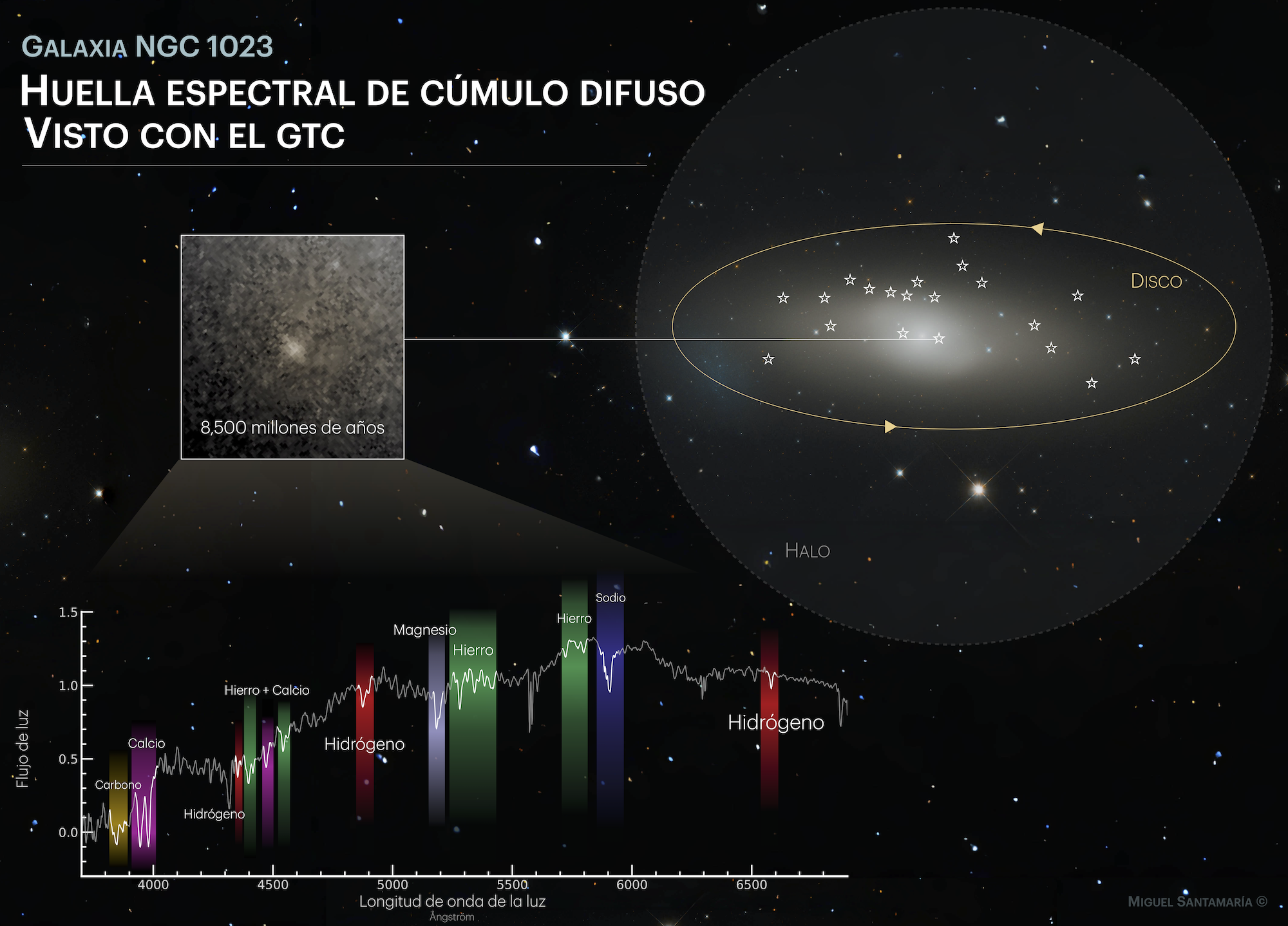 En entrevista, Miguel López Santamaría explica que con su gran tamaño y capacidad de observar múltiples objetos a la vez, el GTC ofrece precisamente esta posibilidad. Las claves para descifrar el enigma fue la medición de la velocidad radial y las huellas químicas de la luz de estos objetos. Los cúmulos pertenecientes a NGC 1023 comparten una cinemática distinta al movimiento de las galaxias del fondo. “Los espectros de los cúmulos genuinos presentan una huella química típica de estrellas viejas, mientras que los objetos nebulosos y las galaxias lejanas exhiben líneas de emisión características de gas ionizado”, subraya.