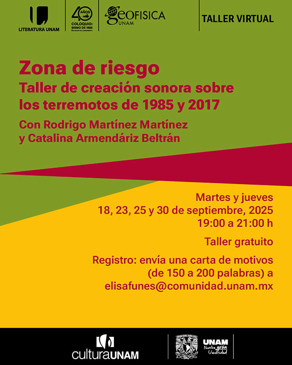 Literatura UNAM, en conjunto con el Instituto de Geofísica de la UNAM, invita a participar en el taller Zona de riesgo. Memoria sonora de los terremotos de 1985 y 2017, un espacio de creación y reflexión que busca recuperar, a través de la escritura creativa y la producción sonora, la memoria colectiva de dos de los sucesos más significativos en la historia reciente del país. La actividad se realiza a 40 años del terremoto del 19 de septiembre de 1985 y a 8 años del ocurrido el 19 de septiembre de 2017, dos episodios que marcaron profundamente la vida social y urbana de México.