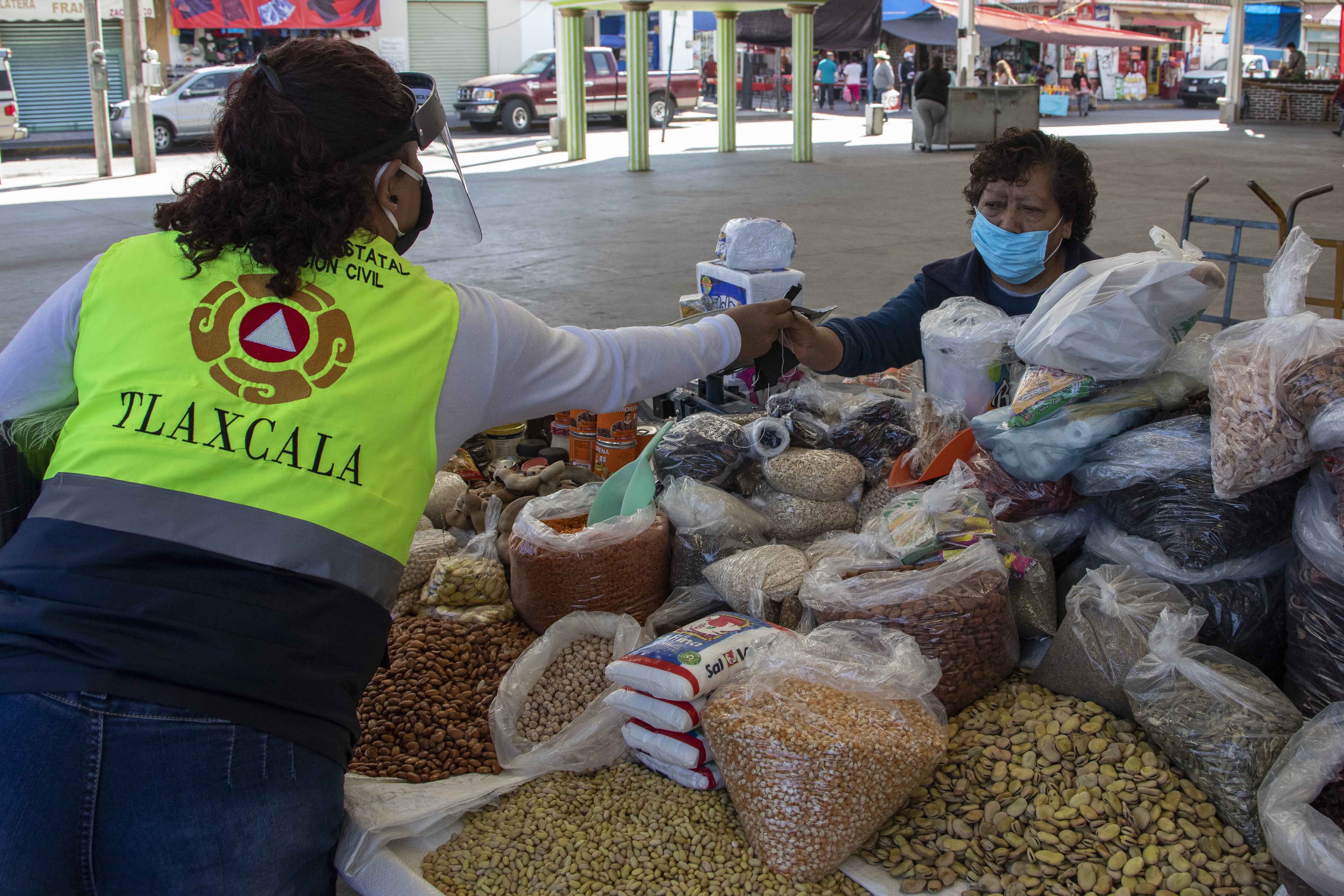 Brigadas de la Coordinación Estatal de Protección Civil (CEPC) y de la Secretaría de Salud (SESA) distribuyeron en los accesos de los centros de abasto de Apizaco, Chiautempan y Zacatelco un total de 7 mil cubrebocas y 50 litros de gel antibacterial entre comerciantes y consumidores