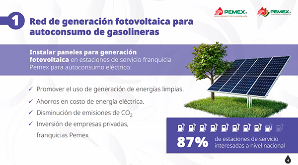 Además, hay proyectos para establecer una red de generación fotovoltaica en las estaciones de servicio franquicia Pemex, a partir de instalar en sus techos paneles solares para autoconsumo. Esta es una manera de promover las energías limpias, ahorrar energía y disminuir las emisiones de dióxido de carbono (CO2).
